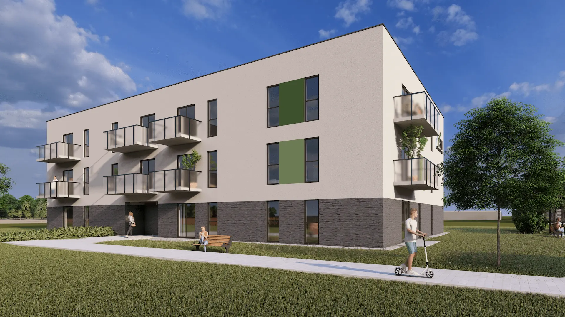 Naszym partnerem i generalnym wykonawcą przedsięwzięcia jest Green Apartments, z którym wspólnie zrealizujemy pierwszy etap projektu obejmujący budowę 23-mieszkaniowego budynku o czterech kondygnacjach, windzie oraz nowoczesnej infrastrukturze towarzyszącej: drogach wewnętrznych, miejscach postojowych, wiatą rowerową, punktami ładowania pojazdów elektrycznych i miejscem gromadzenia odpadów.